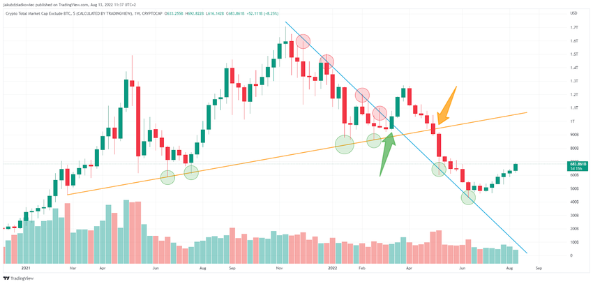 Sin embargo, antes de eso, las altcoins, como el mercado BTC, experimentaron una fuerte caída desde el máximo histórico (ATH) de 1,7 billones de dólares el 10 de noviembre de 2021. Desde entonces, el índice de las altcoins ha caído a lo largo de una línea de resistencia descendente (azul). ) y ha sido repetidamente rechazado por él (círculos rojos).