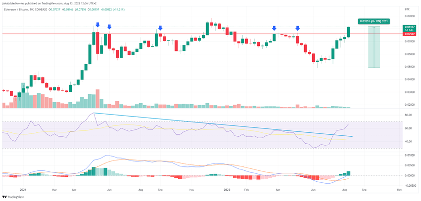 Si ahora miramos la relación con BTC, el gráfico semanal ofrece una perspectiva aún más alcista. ETH/BTC ha estado subiendo desde el fondo en 0.05 BTC, que anteriormente sirvió como resistencia. La validación de esta área fue una señal alcista que inició el aumento en curso.