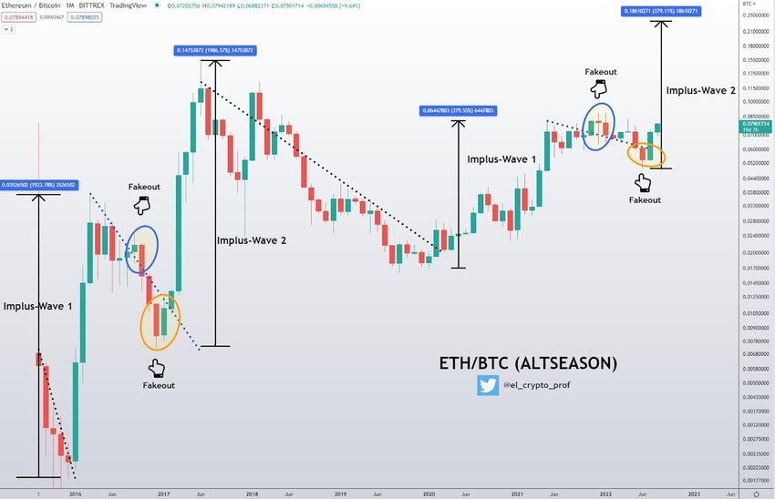 El analista de criptomonedas @el_crypto_prof ha elaborado un gráfico mensual de ETH/BTC, en el que sugiere que estamos al borde de un gran aumento en la valoración de Ethereum frente a Bitcoin.