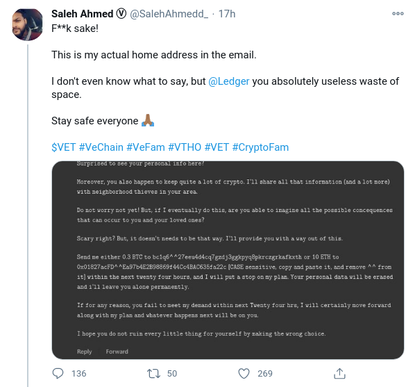 Los clientes preocupados también han acudido a Reddit para desahogarse como alguien que informó que su padre acababa de recibir una amenaza de muerte en su correo electrónico después de haber comprado un Ledger Nano S hace unos meses.