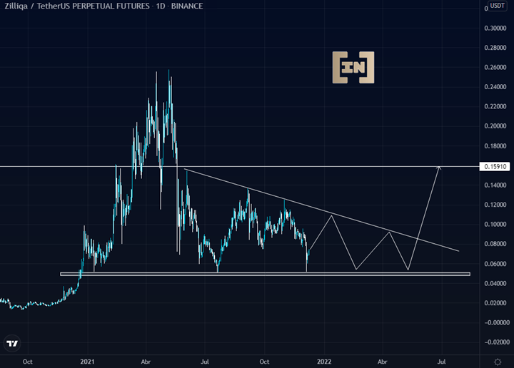Como se puede apreciar en el gráfico el precio de ZIL se encuentra dentro de la formación chartista triángulo descendente. Las ultimas velas de rechazo sobre el soporte, se consideran como velas de acumulación.