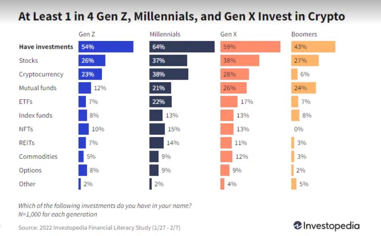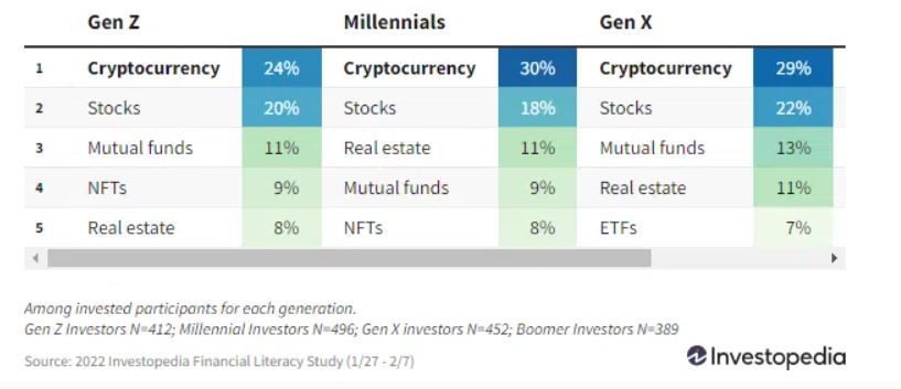 El analfabetismo financiero sigue siendo el factor que más aleja al público del mercado de las criptomonedas. Una encuesta realizada por Investopedia indicó que el 49% de los encuestados tiene un conocimiento inicial de los criptoactivos y el 38% de los millennials invierten en ellos. El estudio encuestó a 4000 estadounidenses entre enero y febrero de 2022.