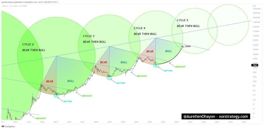 El analista @AurelienOhayon presentó una versión alternativa de la hipótesis de que los ciclos de Bitcoin encajan en patrones circulares. Su interpretación es similar a la segunda versión del autor anterior. Aquí, también, los círculos se cruzan, incluso con más fuerza que en el gráfico anterior.