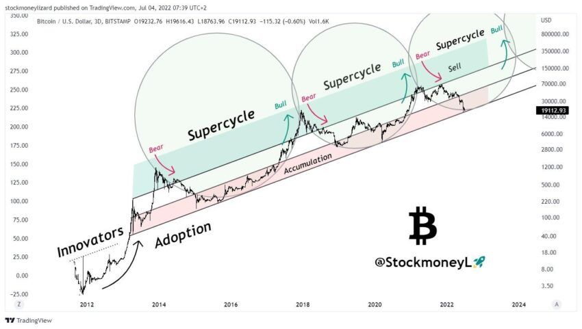 Además, según el autor, hay una línea discontinua de “gran soporte”. Las caídas de los sucesivos ciclos de Bitcoin desde la era de los llamados “Innovadores” de 2011 a 2013 terminan en él.