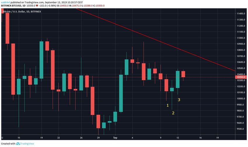 El 11 de septiembre, el precio de Bitcoin marcó un mínimo de $9.943. Luego se produjo un movimiento alcista en tres ondas. BTC alcanzó un máximo de $10.488 el 13 de septiembre. Ha estado retrocediendo desde entonces.