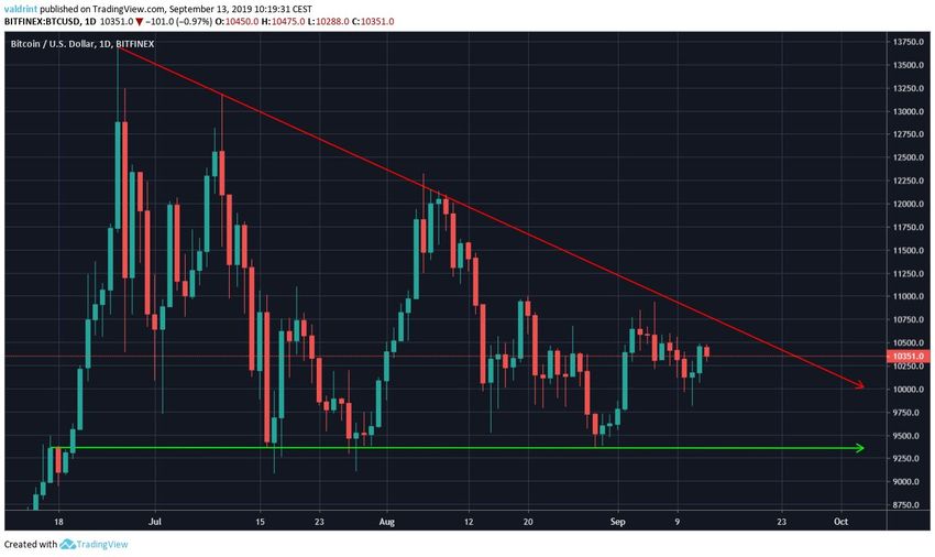 Una mirada a marcos temporales diarios muestra que el precio de Bitcoin ha estado operando dentro de un triángulo descendente desde el 26 de junio.