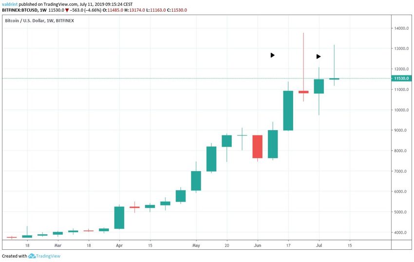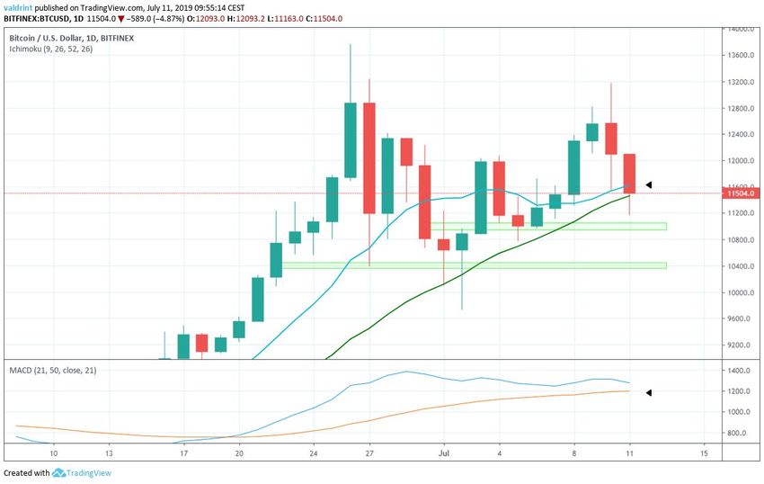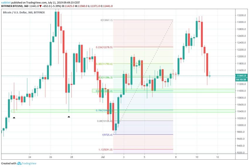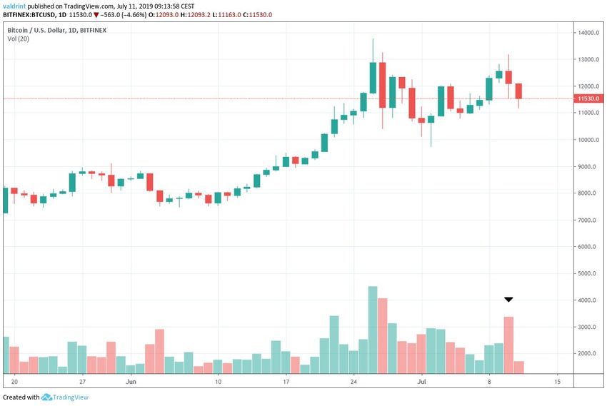 Durante la mayor parte del 10 de julio de 2019, el precio de Bitcoin se negoció por encima de $12.800. Sin embargo, a las 15:30 (UTC +2) se produjo un movimiento bajista masivo. Al final del día, el precio había alcanzado valores por debajo de $11.600, una disminución de más del 10 por ciento.