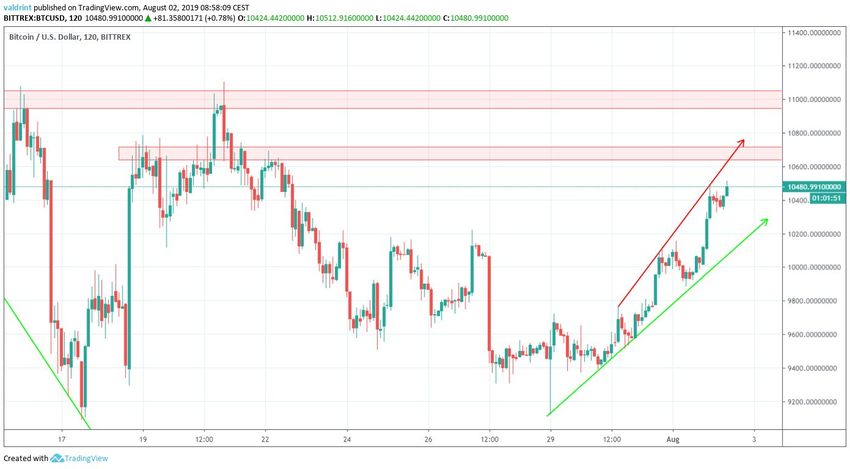 El 27 de julio de 2019, el precio de Bitcoin alcanzó un máximo de $10.222. Lo siguió una rápida caída. El precio se negoció entre $9400-$9600 hasta el 31 de julio, cuando comenzó un movimiento alcista. Ha estado subiendo desde entonces.