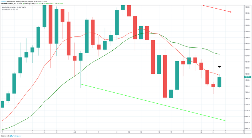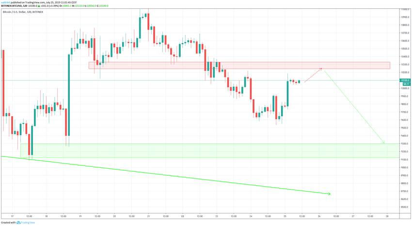 El 21 de julio de 2019, el precio de Bitcoin (BTC) alcanzó un máximo de $11.098 antes de que se produjera una rápida caída. Desde entonces, el precio ha estado en una tendencia bajista gradual, generando mínimos más bajos. El 24 de julio marcó un mínimo de $9354 y un movimiento ascendente comenzó el mismo día.