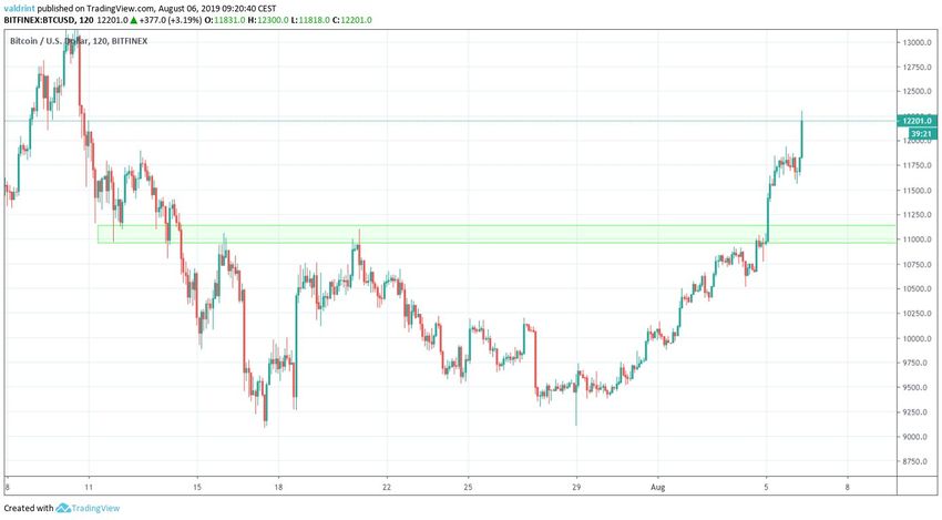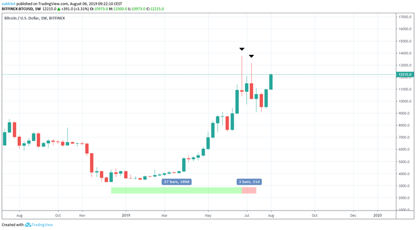 El 26 de junio de 2019, el precio de Bitcoin alcanzó un máximo de $13.764. Una caída fue seguida por un movimiento alcista. El 10 de julio, alcanzó un máximo de $13.161. Se produjo otra caída. El 17 de julio, BTC marcó un mínimo de $9.084. Ha estado subiendo desde entonces.