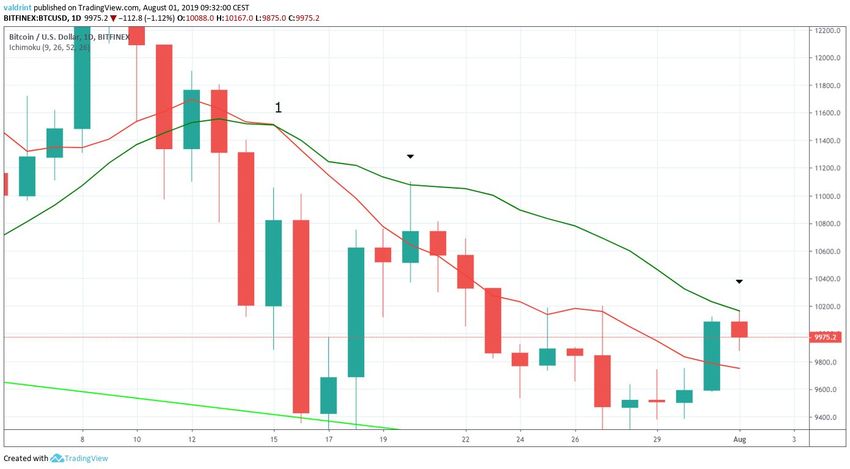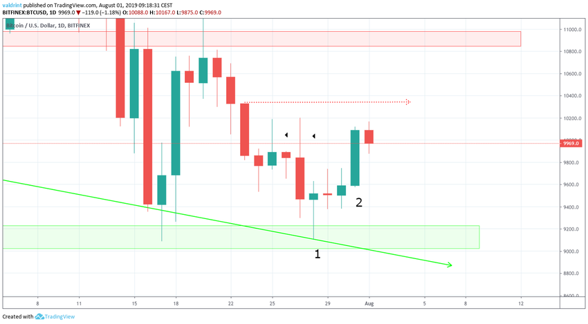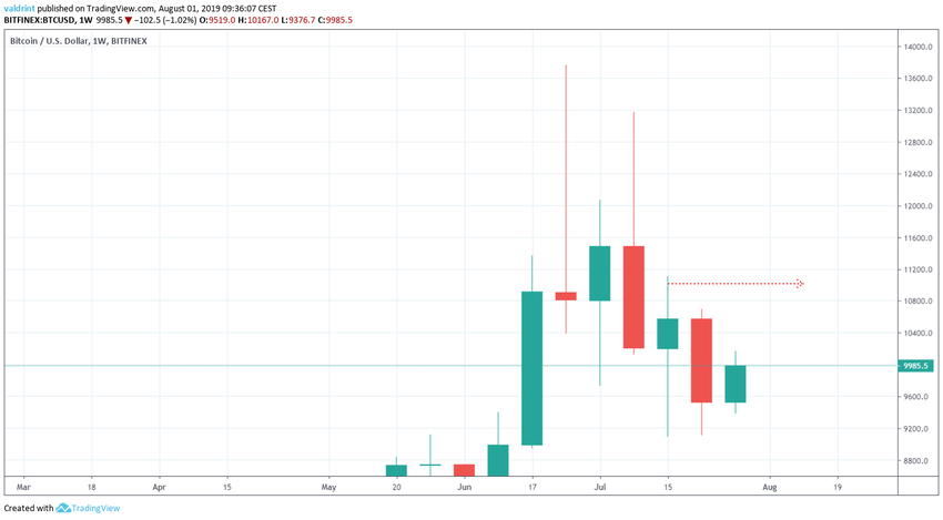 El 25 de julio de 2019, el precio de Bitcoin (BTC) alcanzó un máximo de $10.188. Se produjo un pequeño retroceso. El 27 de julio, el precio alcanzó máximos similares cerca de $10.200. Lo siguió una rápida caída. Luego marcó mínimos cerca de $9300 el 30 de julio. Comenzó otro movimiento alcista, y el precio alcanzó máximos cerca de $10.200 por tercera vez el 1 de agosto.