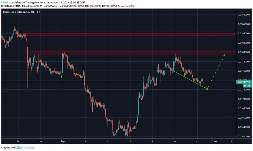 El 6 de septiembre de 2019, el precio de Ethereum marcó un mínimo de ₿0,0161. Lo siguió un rápido movimiento alcista y el precio de ETH alcanzó un máximo de ₿0,0179 el 11 de septiembre. Ha estado retrocediendo desde entonces.