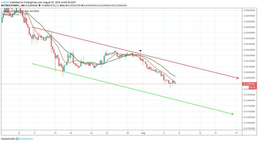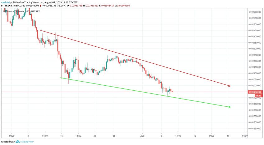 El 16 de julio de 2019, el precio de Ethereum marcó un mínimo de ₿0,0201. Luego se produjo un movimiento alcista. ETH alcanzó máximos de ₿0,0223 en múltiples ocasiones. Ha estado retrocediendo desde entonces. El 6 de agosto, marcó un mínimo de ₿0,0190.