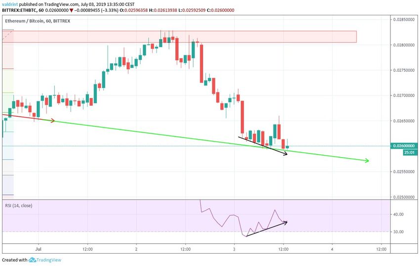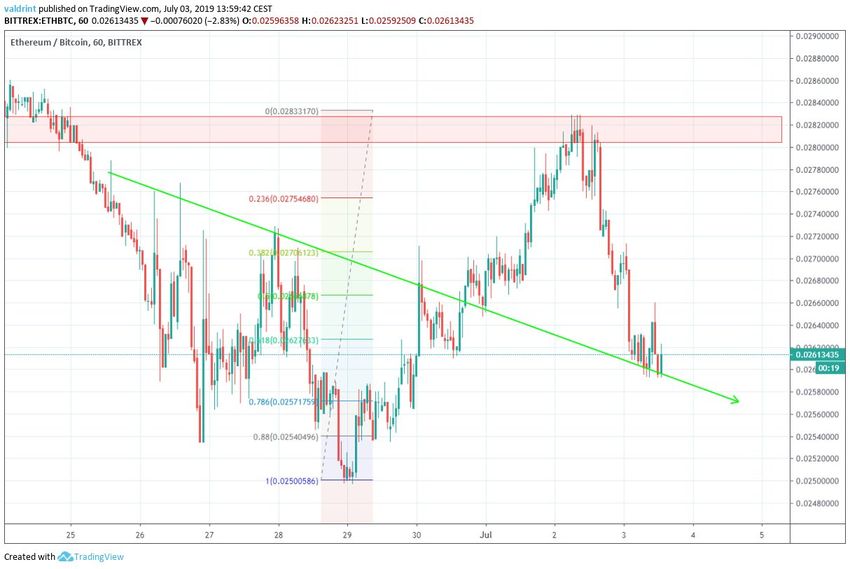 El 29 de junio de 2019, el precio de Ethereum alcanzó un mínimo de ₿0,025. Se produjo un movimiento alcista y el precio de ETH alcanzó un máximo de ₿0,0283 el 2 de julio.