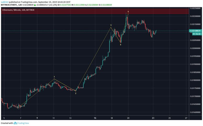 Además, el movimiento del precio de Ethereum se parece mucho a una formación de cinco ondas de Elliott.