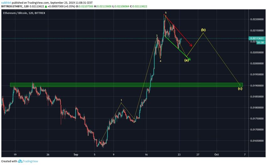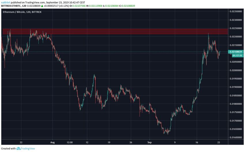 El 7 de septiembre de 2019, el precio de Ethereum marcó un mínimo de ₿0,016. Lo siguió un movimiento ascendente gradual, que se intensificó el 14 de septiembre. ETH alcanzó un máximo de ₿0,022 el 19 de septiembre. Ha estado retrocediendo desde entonces.
