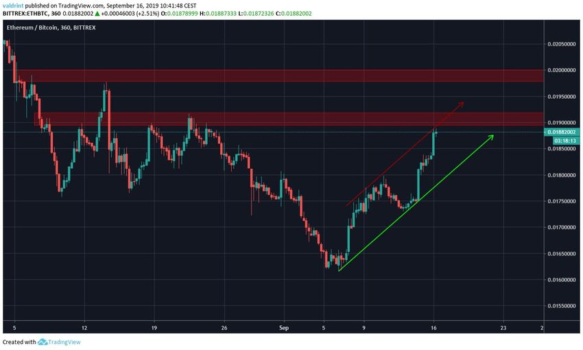 El precio de Ethereum ha estado subiendo desde en 6 de septiembre de 2019. El movimiento ascendente comenzó en un mínimo de ₿0,0161. Tras un rápido movimiento alcista, el precio de ETH alcanzó un máximo de ₿0,0179 el 11 de septiembre. Lo siguió una breve caída antes que Ethereum iniciara otro movimiento alcista, el cual lo llevó a un máximo de ₿0,0188 el 16 de septiembre.