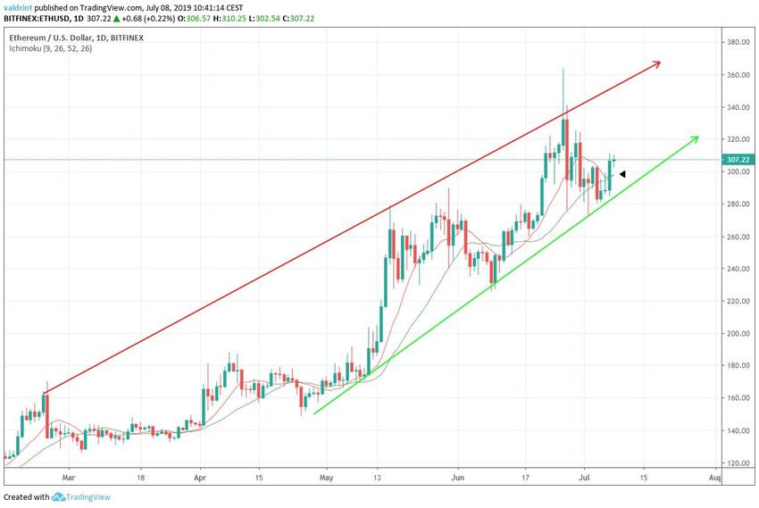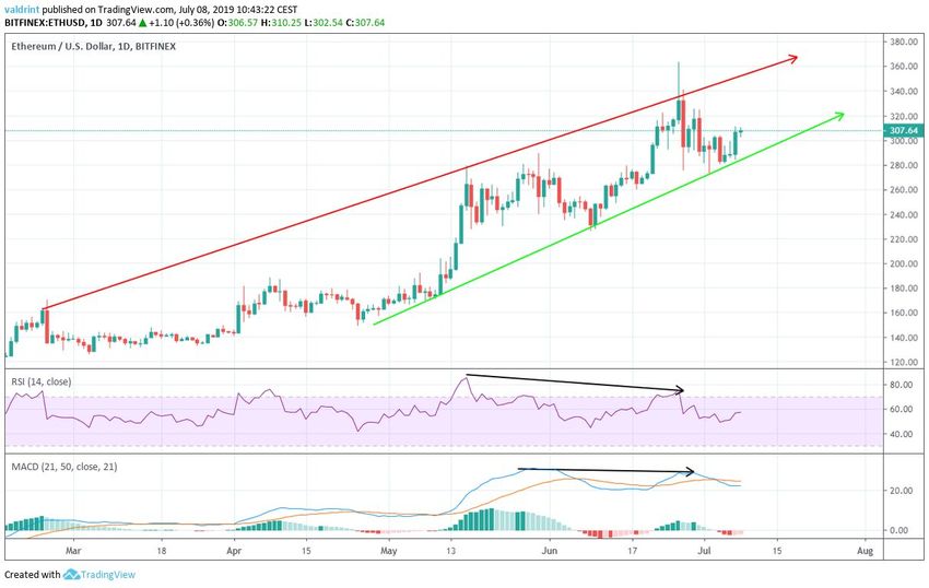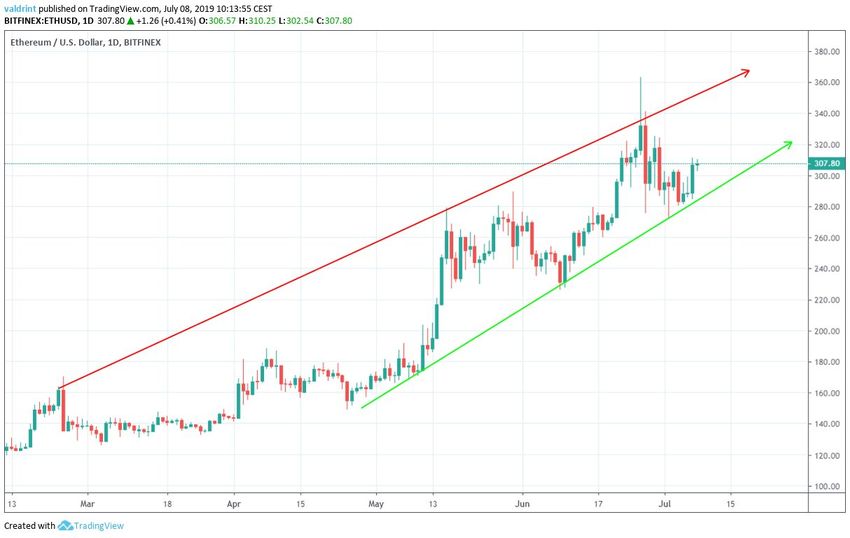 El 30 de junio de 2019, el precio de Ethereum alcanzó un máximo de $325. Fue seguido por una tendencia bajista. El 2 de julio, el precio marcó un mínimo de $272. El precio de ETH ha estado subiendo desde entonces.
