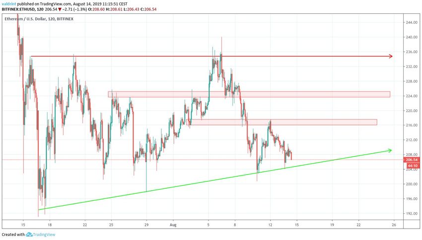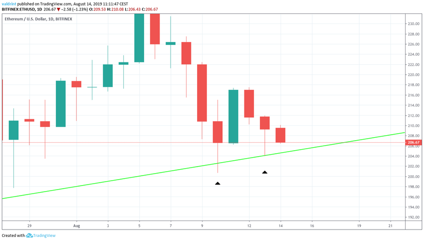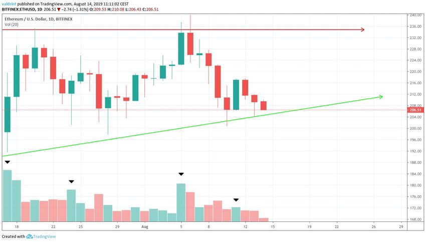 El 6 de agosto de 2019, el precio de Ethereum alcanzó un máximo de $240. Una tendencia bajista comenzó el mismo día. El 10 de agosto, el precio de ETH marcó un mínimo de $201. Ha estado avanzando desde entonces.