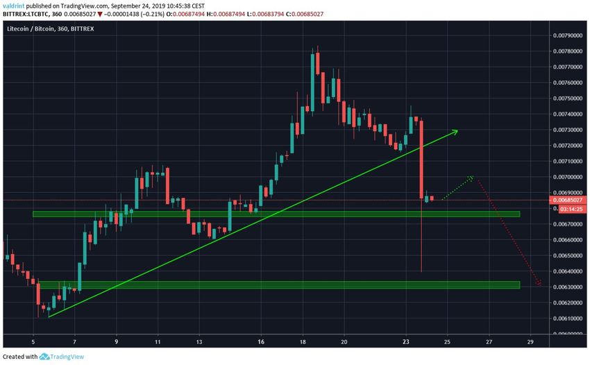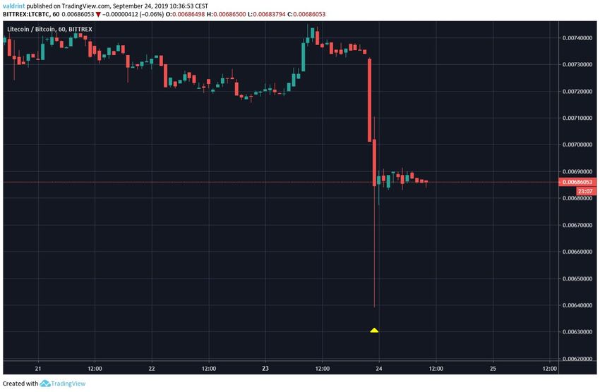 El 18 de septiembre, el precio de Litecoin alcanzó un máximo de ₿0,0078. Se produjo un lento retroceso hasta el 23 de septiembre. Luego, se produjo una rápida caída (flash crash) y LTC perdió 12,7 por ciento de su valor en un lapso de dos horas, marcando un mínimo de ₿0,0064.