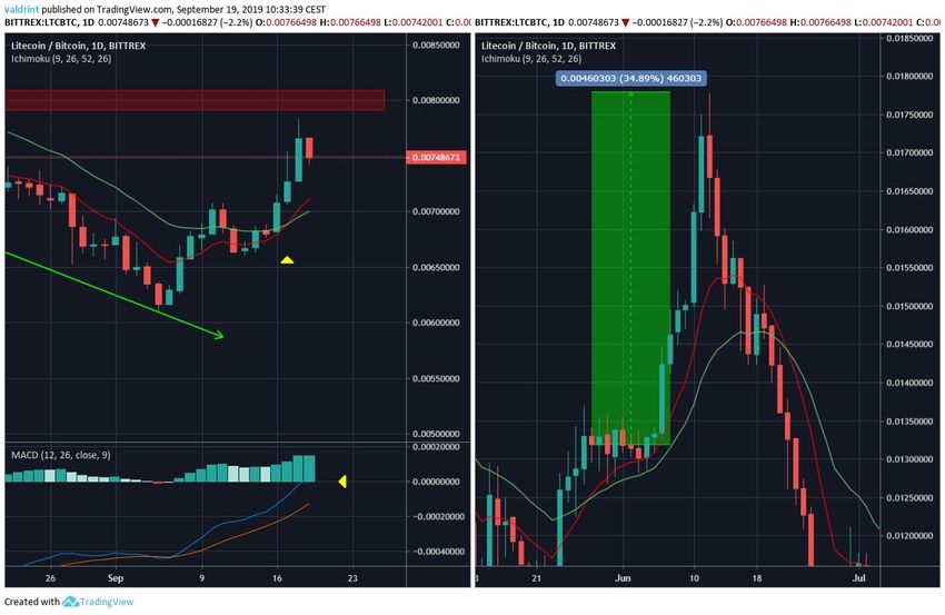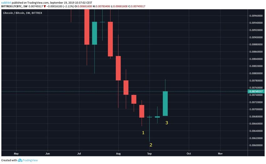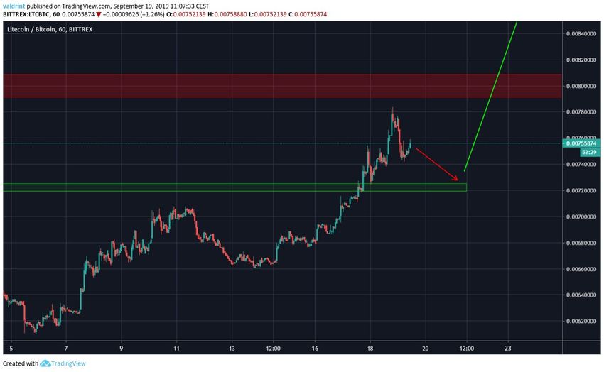El 5 de septiembre de 2019, el precio de Litecoin marcó un mínimo de ₿0,0061. Desde entonces, ha iniciado dos movimientos alcistas con una duración de cinco días cada uno, subiendo 16 por ciento y 18 por ciento respectivamente. El 18 de septiembre, Litecoin alcanzó un máximo de ₿0,0078.