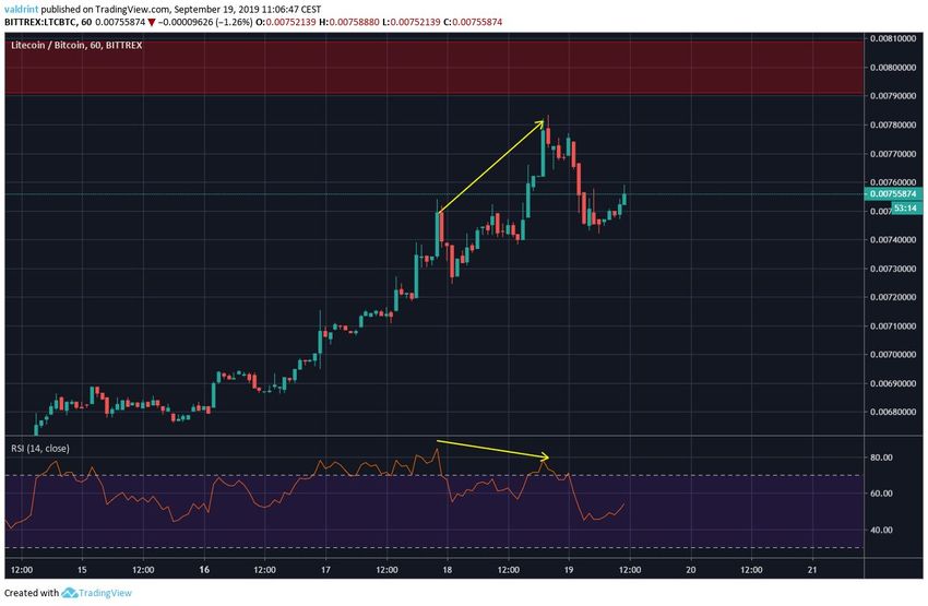 Volviendo al gráfico de una hora, podemos ver que LTC ha comenzado a mostrar señales de debilidad, en la forma de una divergencia bajista.