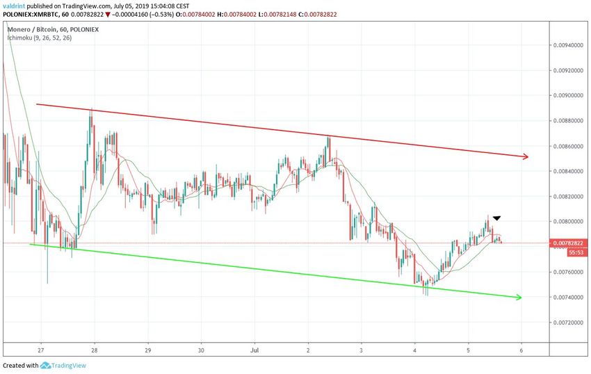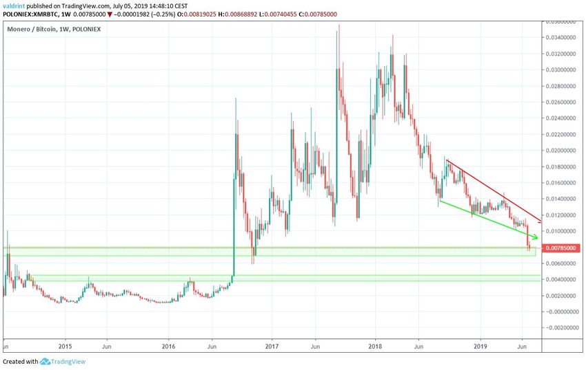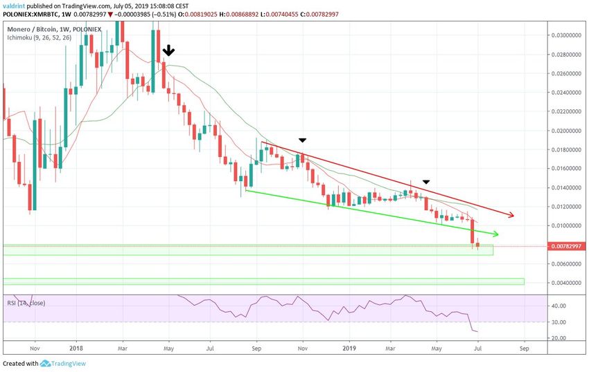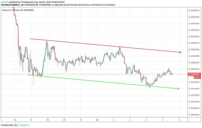 El 25 de junio de 2019, Monero inició una rápida caída. Un mínimo de ₿0.0075 fue marcado el día siguiente. Tras una suba gradual, el precio de XMR alcanzó un mínimo más bajo de ₿0.0074 el 4 de julio.