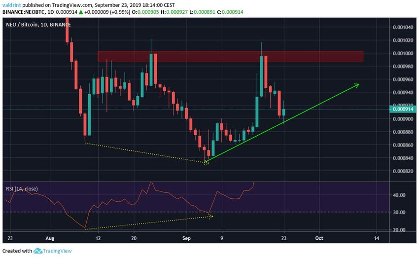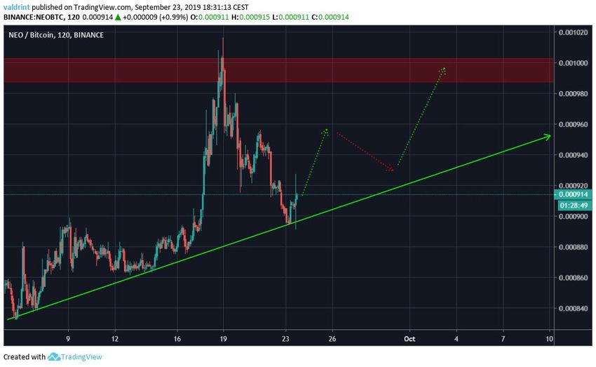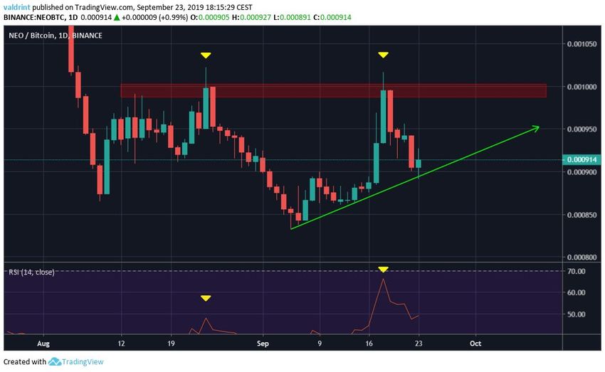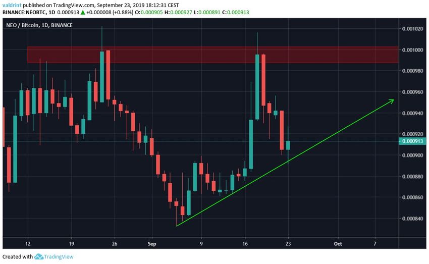 El precio de NEO ha estado siguiendo una línea de soporte ascendente desde el 5 de septiembre.