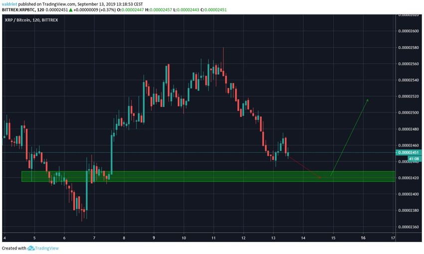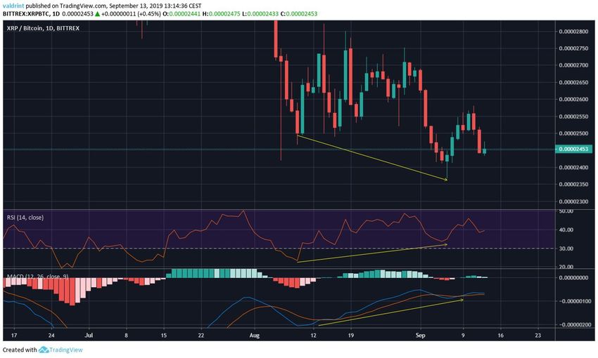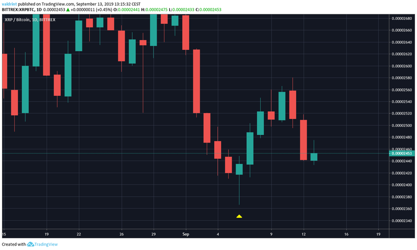El 6 de septiembre de 2019, el precio de XRP alcanzó un mínimo de 2366 satoshis. Se produjo un movimiento alcista y el precio de XRP alcanzó un máximo de 2580 satoshis el 11 de septiembre. Ha estado retrocediendo desde entonces.