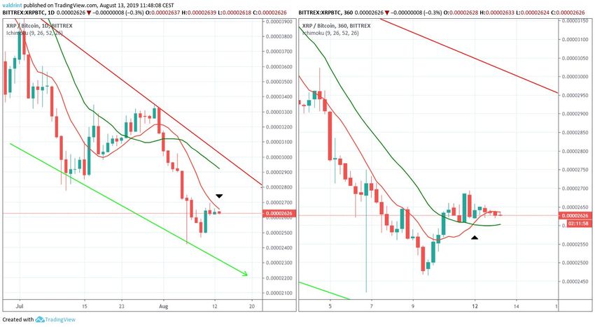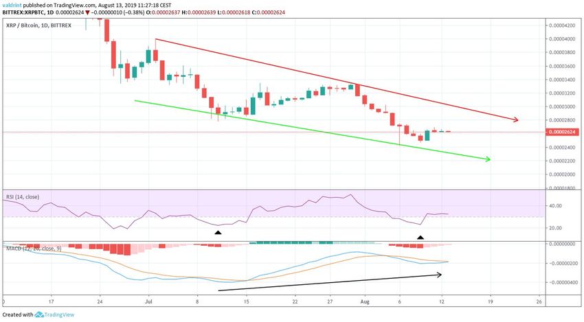 El 4 de agosto de 2019, el precio de XRP alcanzó un máximo de 3023 satoshis. Una disminución gradual siguió hasta el 9 de agosto, cuando el precio llegó a un mínimo de 2467 satoshis. Ha estado avanzando desde entonces.