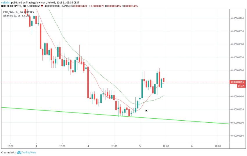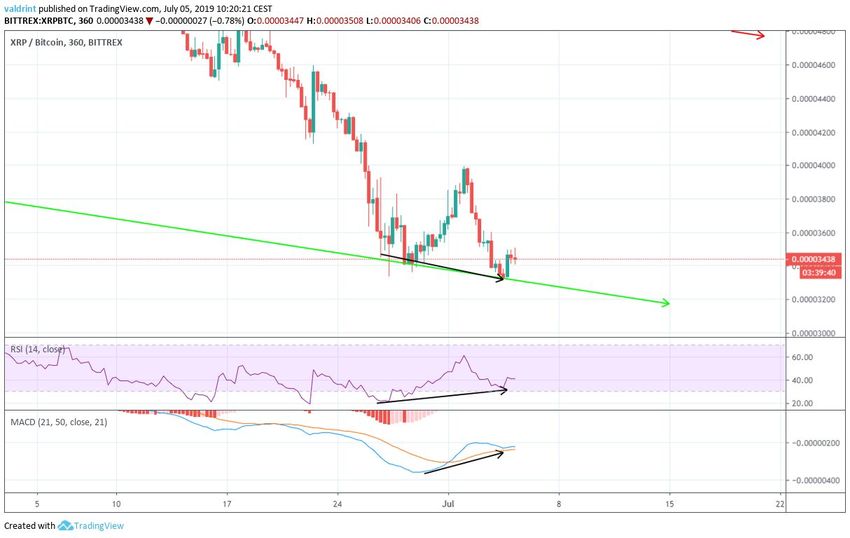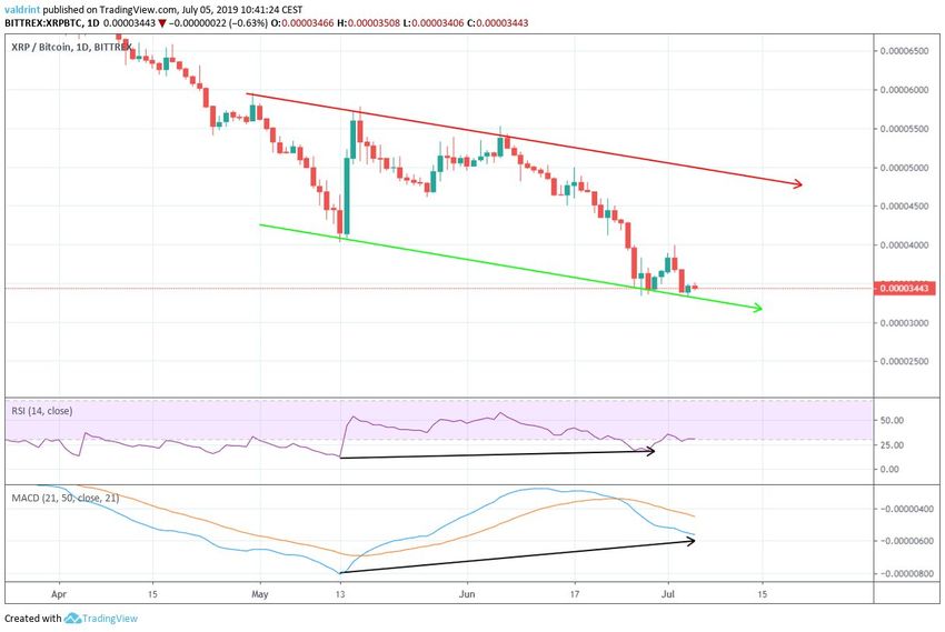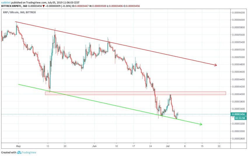 El 30 de abril de 2019, el precio de XRP alcanzó un máximo de 5956 satoshis. Ha estado retrocediendo desde entonces, marcando mínimos más bajos.