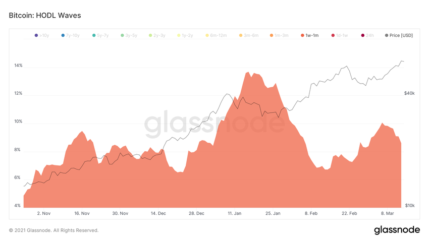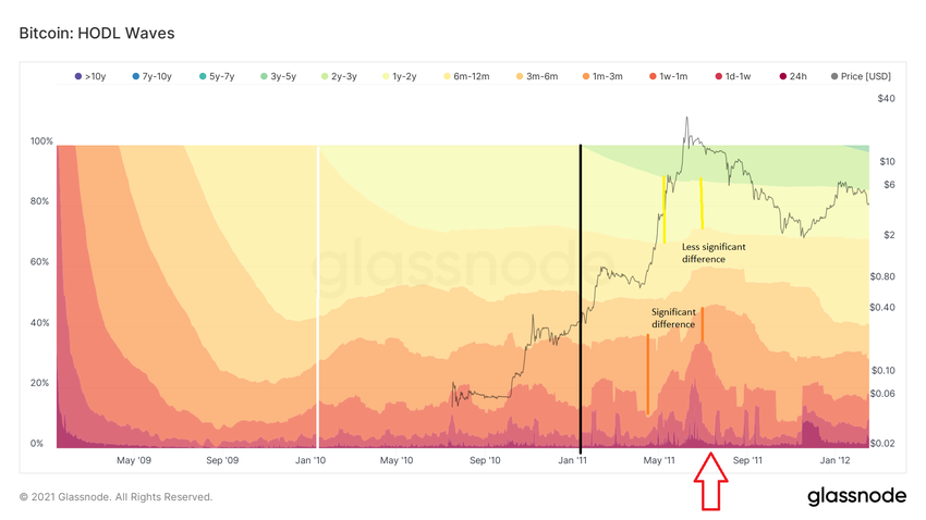En el punto álgido del pico, la banda de 1 a 3 meses (naranja) es considerablemente menor que hace sólo tres meses. Esto significa que un número importante de monedas que no se habían movido en los 1 a 3 meses anteriores se están moviendo ahora.