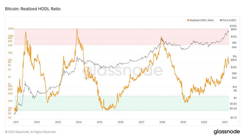 Llegamos a la misma conclusión cuando utilizamos el Ratio HODL Realizado (RHODL Ratio).