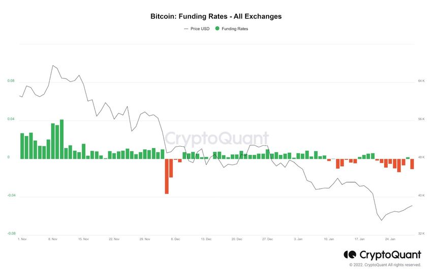 No obstante, en la segunda quincena de enero ya vemos un predominio de las tasas de financiación negativas, lo que sugiere un sesgo hacia posiciones cortas en el mercado. Curiosamente, las tasas de financiación negativas se están profundizando, a pesar de que el precio ha rebotado desde el fondo a 32,900 dólares y está subiendo. El trader de criptomonedas @Crypt0Jed1 comentó sobre la situación de la siguiente manera: