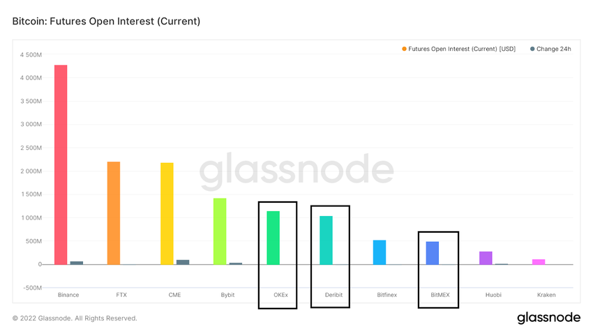 Sin embargo, la situación actual en Binance es la excepción y no la regla. Otros exchanges importantes actualmente informan un interés abierto significativamente menor que hace unos meses. Los ejemplos son: Okex, Bitmex, Deribit (resaltados arriba).