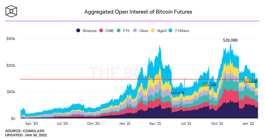 Curiosamente, el valor actual del interés abierto global es mayor (en un 8% frente a los 13,190 millones de dólares) que a finales de septiembre de 2021, cuando el precio de BTC tocó fondo en 39,600 dólares. Al mismo tiempo, también es significativamente mayor (en un 36 % frente a los 10,470 millones de dólares) que en julio de 2021, cuando Bitcoin alcanzó los 29,000 dólares.