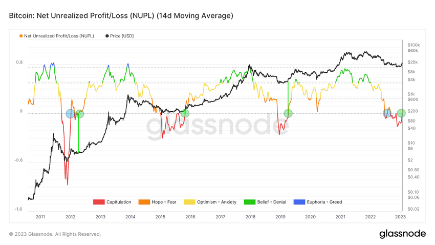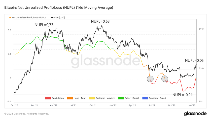 En el análisis de hoy, BeInCrypto evalúa a uno de los indicadores on-chain más conocidos de Bitcoin: Relative Unrealized Profit and Relative Unrealized Loss (NUPL). La acción positiva del precio de Bitcoin (BTC) en las primeras semanas de 2023 hizo que el indicador generara una señal para iniciar un ciclo alcista.