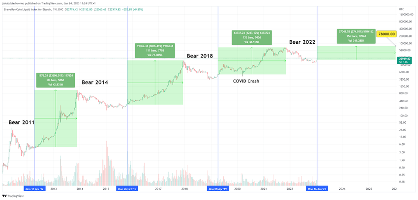 Con base en las premisas anteriores, se puede intentar estimar el momento y la magnitud del pico de Bitcoin en el próximo mercado alcista. Por supuesto, dos suposiciones deben ser ciertas. Primero, ya se ha alcanzado el fondo del precio de BTC.