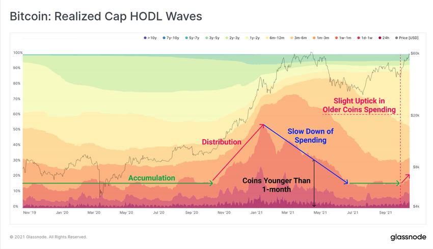 La liquidación de posiciones LTH (flecha roja) comenzó a fines de octubre de 2020 y duró hasta finales de marzo de 2021. Sin embargo, tan pronto como se alcanzó el pico de 64,850 dólares, las posiciones a largo plazo comenzaron a acumularse nuevamente, lo que continúa hoy (flecha verde).