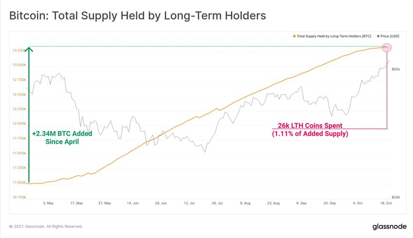 En un tweet reciente, el analista on-chain @_Checkmatey_ señaló que el suministro total de LTH alcanzó un máximo histórico a mediados de octubre, justo antes del nuevo ATH para el precio de Bitcoin. Señaló que el suministro de LTH aumentó en 2,34 millones de BTC entre abril y octubre.