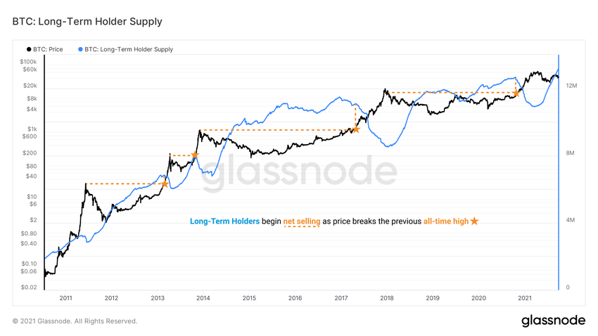Curiosamente, en cada caso coinciden con una inversión de tendencia en el comportamiento de la oferta de LTH. Muy a menudo, el nuevo ATH para el precio de Bitcoin es el punto de inflexión (asterisco) del gráfico de oferta de LTH (azul). Posteriormente, la disminución progresiva de las tenencias a largo plazo se refleja en un aumento exponencial en el precio de BTC, lo que lleva al pico del ciclo.