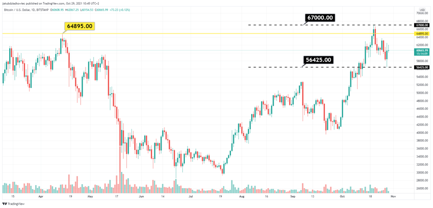 En las últimas dos semanas, Bitcoin ha vuelto a la parte superior del rango desde el ATH histórico de abril de 2020 (línea amarilla). Además, BTC fijó el nuevo ATH en 67,000 dólares el 20 de octubre. Después cayó a un mínimo de 56,425 dólares el 28 de octubre.
