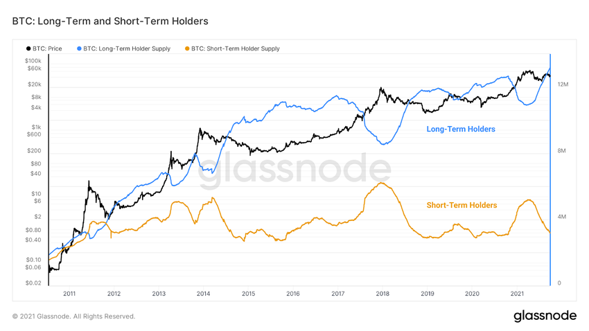 Un artículo reciente de Glassnode señaló la correlación histórica entre el suministro de Bitcoin en manos de los holders a largo plazo (LTH) y los holders a corto plazo (STH). Ambos gráficos se comportan casi como imágenes en espejo: cuando las tenencias de LTH aumentan, las tenencias de STH disminuyen y viceversa.