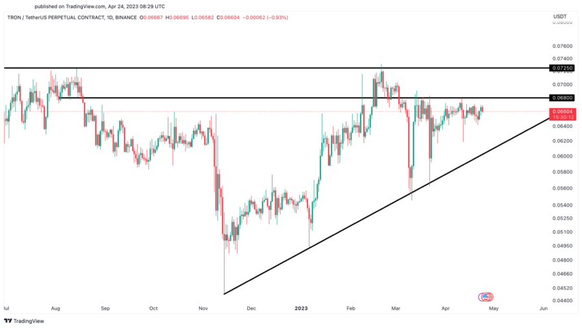 Sponsored Sponsored- 0.068 dólares: Este nivel ha actuado como una fuerte barrera para el precio de TRON, con múltiples retests en el pasado. Superar este nivel de resistencia podría señalar un cambio en el sentimiento del mercado y allanar el camino para una mayor apreciación de los precios.
