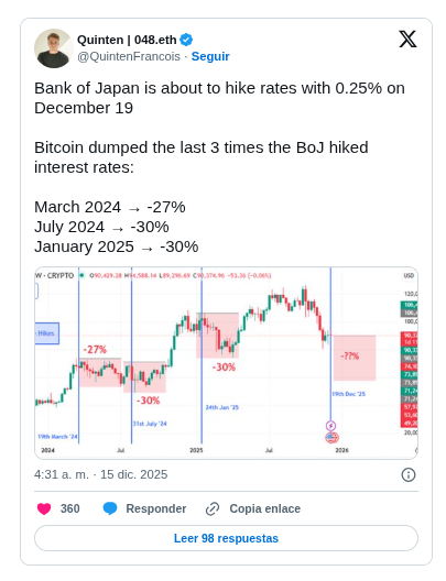Cuando aumenta la expectativa de tasas más altas, los inversores deshacen posiciones en activos volátiles para cubrir sus pasivos en yenes. En episodios anteriores, Bitcoin reaccionó con caídas de entre 20% y 30% tras decisiones similares. Este antecedente llevó a muchos traders a reducir exposición de forma anticipada.