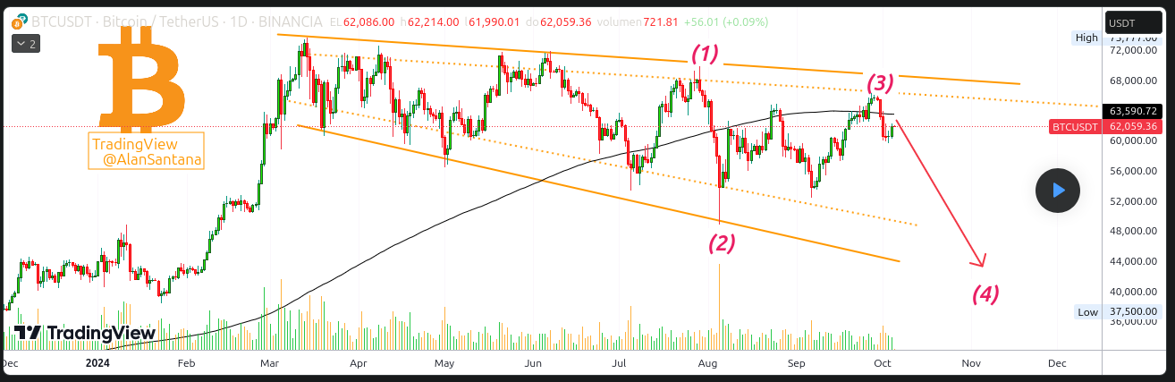 Según Santana, el precio de Bitcoin ha estado atrapado en un canal descendente desde abril de este año, registrando máximos y mínimos cada vez más bajos. El reciente intento de tocar los 65,000 dólares fue seguido rápidamente por una nueva caída, lo que refuerza la hipótesis de una mayor presión bajista.