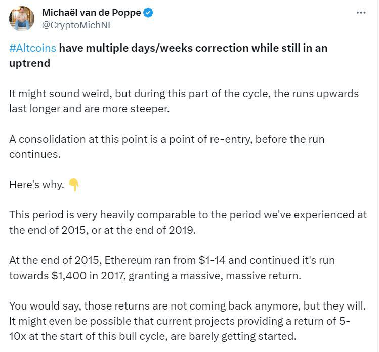 El mercado de altcoins se enfrenta a una corrección que puede durar semanas. La caída de algunas criptomonedas puede llegar al 50%. Al mismo tiempo, la corrección no cancela la transición del mercado a la fase de crecimiento. Michaël van de Poppe, un popular analista de la comunidad cripto, compartió esta opinión con sus suscriptores.
