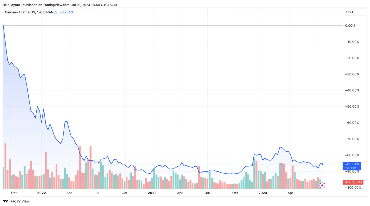Además, señala la disminución de la actividad de los desarrolladores, lo que, según él, contribuye a su relevancia decreciente en comparación con otras redes blockchain. Sin mencionar que ADA está aproximadamente un 85% por debajo de sus máximos históricos de 2021.