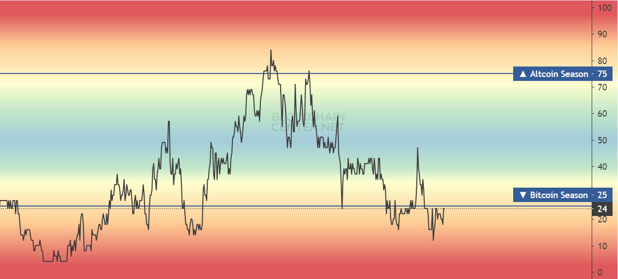 Finalmente, las ganancias de estos activos, junto con capital adicional, comienzan a fluir hacia las altcoins. Esta rotación de capital es lo que desencadena una altseason. Según el Altseason Index, los mercados actualmente aún están en la temporada de Bitcoin.