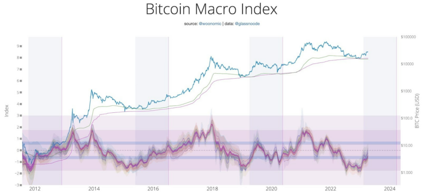 El gráfico principal al que se refiere Willy Woo es el llamado Bitcoin Macro Index. El valor de este índice acaba de romper por encima de la línea azul inferior.